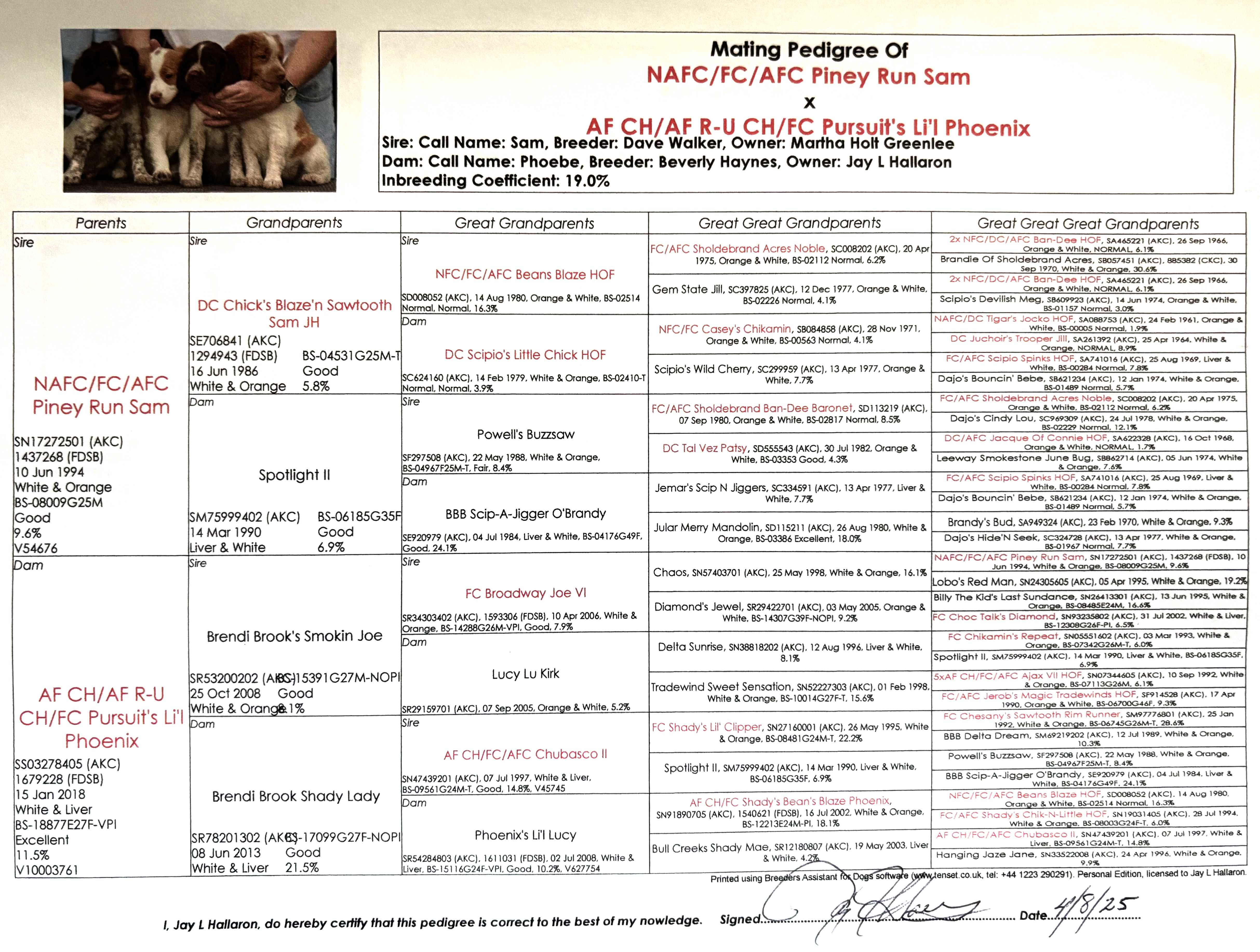 Our dam, Pursuit’s Li’l Phoenix (Phoebe) became an American Field Champion, a Runner-Up Field Champion and an AKC Field Champion when only 3 years old. She is OFA excellent for hips. The sire, Piney Run Sam (Sam), was a National Amateur Field Champion, AKC Field Champion and and AKC Amateur Field a champion. He was OFA good for hips. Sam also the sire of one of the most prestigious National Field Champions, National Amateur Field Champions and Hall of Fame members in Brittany history, Just Call Me Roy. This Sam x Phoebe litter is a frozen semen litter. We do not do repeat breedings so this is a “one and only” litter that will never be offered ever again.